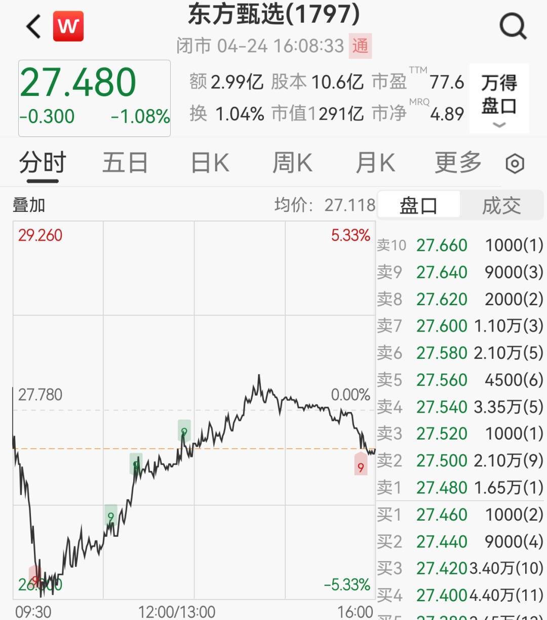 截至周五港股收盘,东方甄选最新股价为27.48港元/股,当日下跌1.08%,市值291.18亿港元。