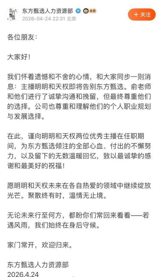 4月24日晚,东方甄选人力资源部在东方甄选App社区发文宣布主播明明与天权离职。